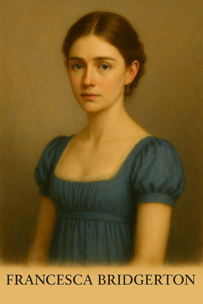 Francesca Bridgerton:โฏThe quietest sibling who, after being widowed young, finds a deep, passionate love with her late husband’s cousin. (Book 6)