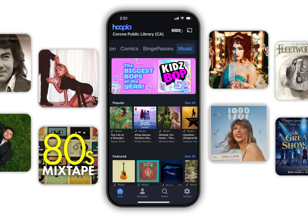 Hoopla is a free online library app for music—and not only that, Hoopla also has movies, TV shows, eBooks, audiobooks, comics, magazines, and more, all in one place. Read, listen, and watch with Hoopla’s free app!