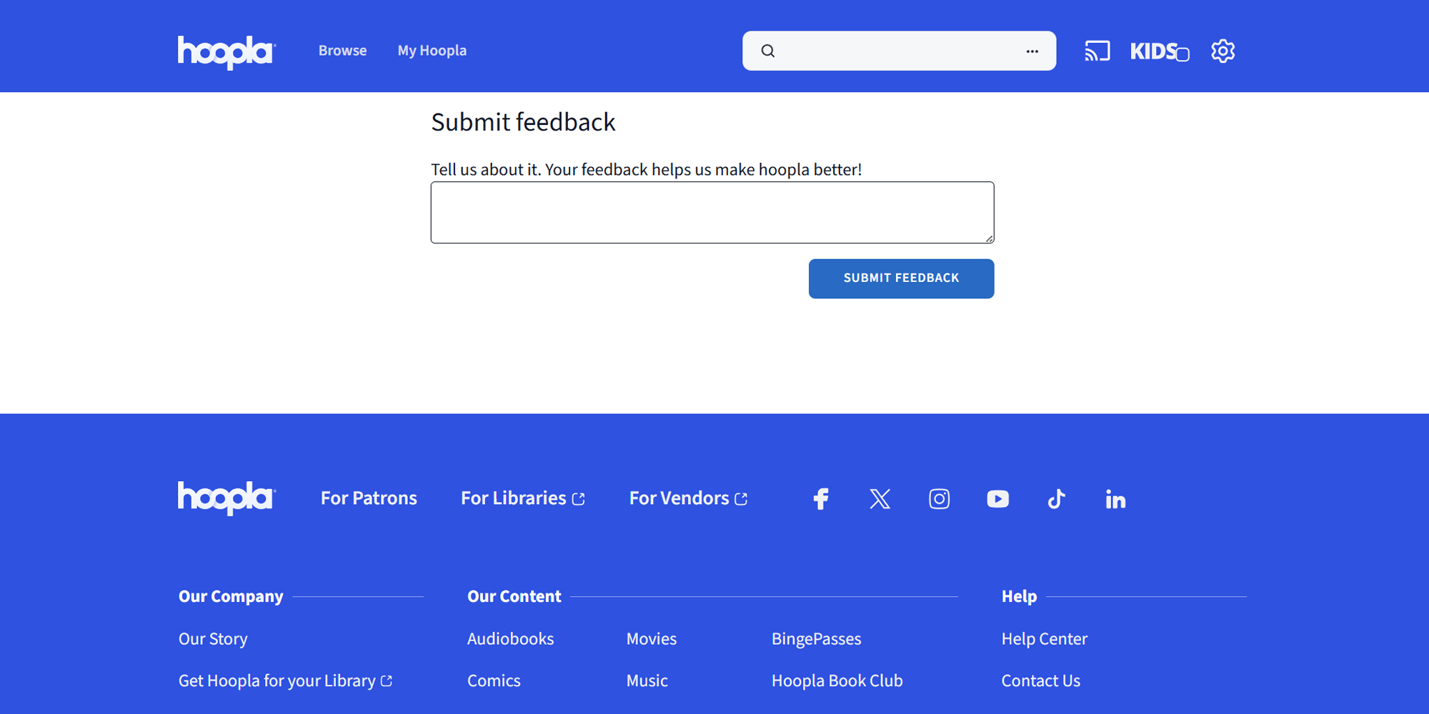 - When reporting an issue, please be sure you’re logged into your Hoopla account so our support team can access details and respond promptly.